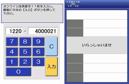 1.店員に「オンライン決済」とお伝えください。POS画面に「オンライン決済番号」を入力し、入力ボタンをタッチしてください。